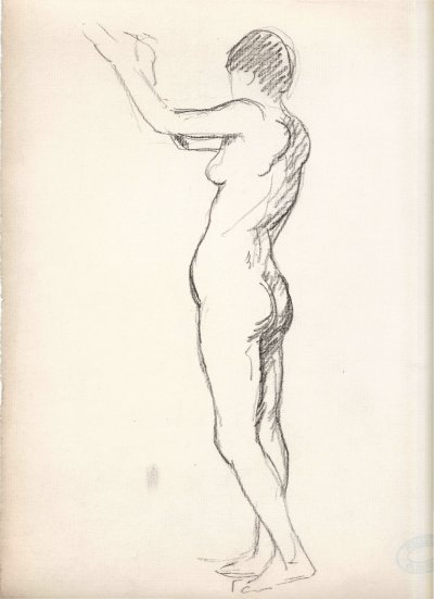 croquis de nu debout de dos bras gauche levé ( sketch of back view of standing nude with raised left arm )